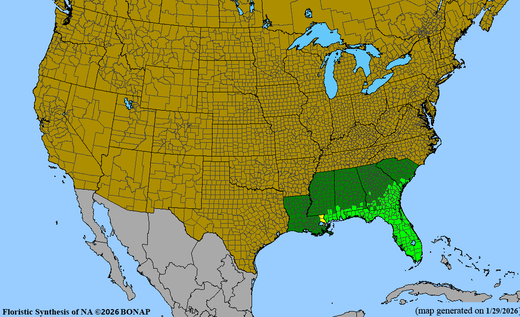 The limited range of saw palmetto. Credit: Kartesz, J.T. 2026. Floristic Synthesis of North America, Version 1.0. Biota of North America Program (BONAP) [website http://bonap.org/] Chapel Hill, N.C