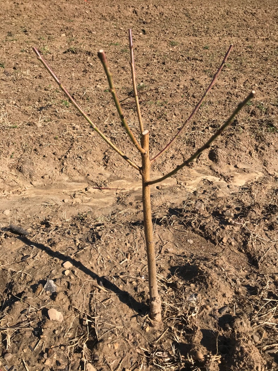 Heading cut made on a recently planted whip, selecting five scaffolds and stopping terminal growth. Photo Credit: David Lawrence, Auburn University