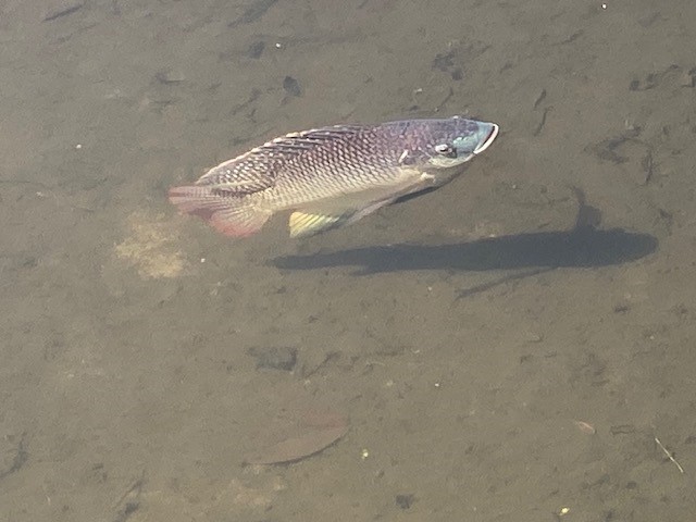 We estimate there are about 60 Blue and Nile tilapia living in the upper “right arm” of Bayou Chico east of “W” Street (could be under estimated). There was a collection effort this year and 25 of those fish were removed. Surveys west of “W” street have not shown in evidence of tilapia invasion. We encourage waterfront residents of Bayou Chico to report any sightings of this fish.