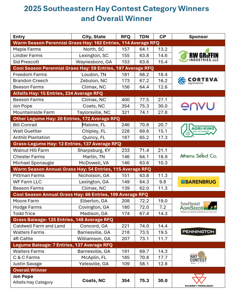 The 2025 Top RFQ was in the alfalfa hay category from Beeson Farms from Climax, NC with an index breaking 400. Beeson Farms won the Grand Prize in 2022 and, therefore, was ineligible to win the Grand Prize in 2025. As a result, the Grand Prize went to Jon Pope from Coats, NC, with an alfalfa hay entry with an RFQ of 354.