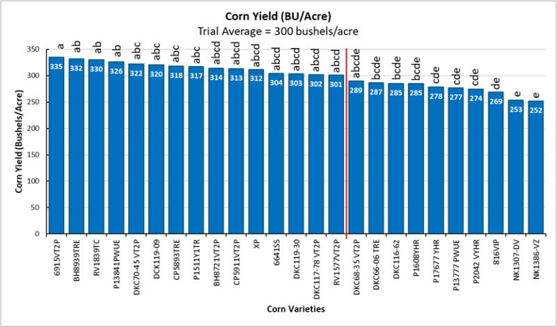 The total fertilizer used in Citra was 227 lbs/ac N, 216 lbs/ac K, 2 lbs/ac S. Yield was collected at harvest using a plot combine. The two center rows of each plot were harvested, and grain weight and moisture were recorded. Final yield values were adjusted to 15.5% moisture. Figure 7 shows the yield for each corn variety for Citra. The trial average yield was 300 bushel per acre.