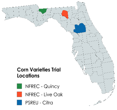 In 2025, we evaluated 26 corn varieties from multiple seed companies under irrigation at three sites: the North Florida Research and Education Center (NFREC) in Live Oak, NFREC in Quincy, and the Plant Science Research and Education Unit (PSREU) in Citra (Figure 1).