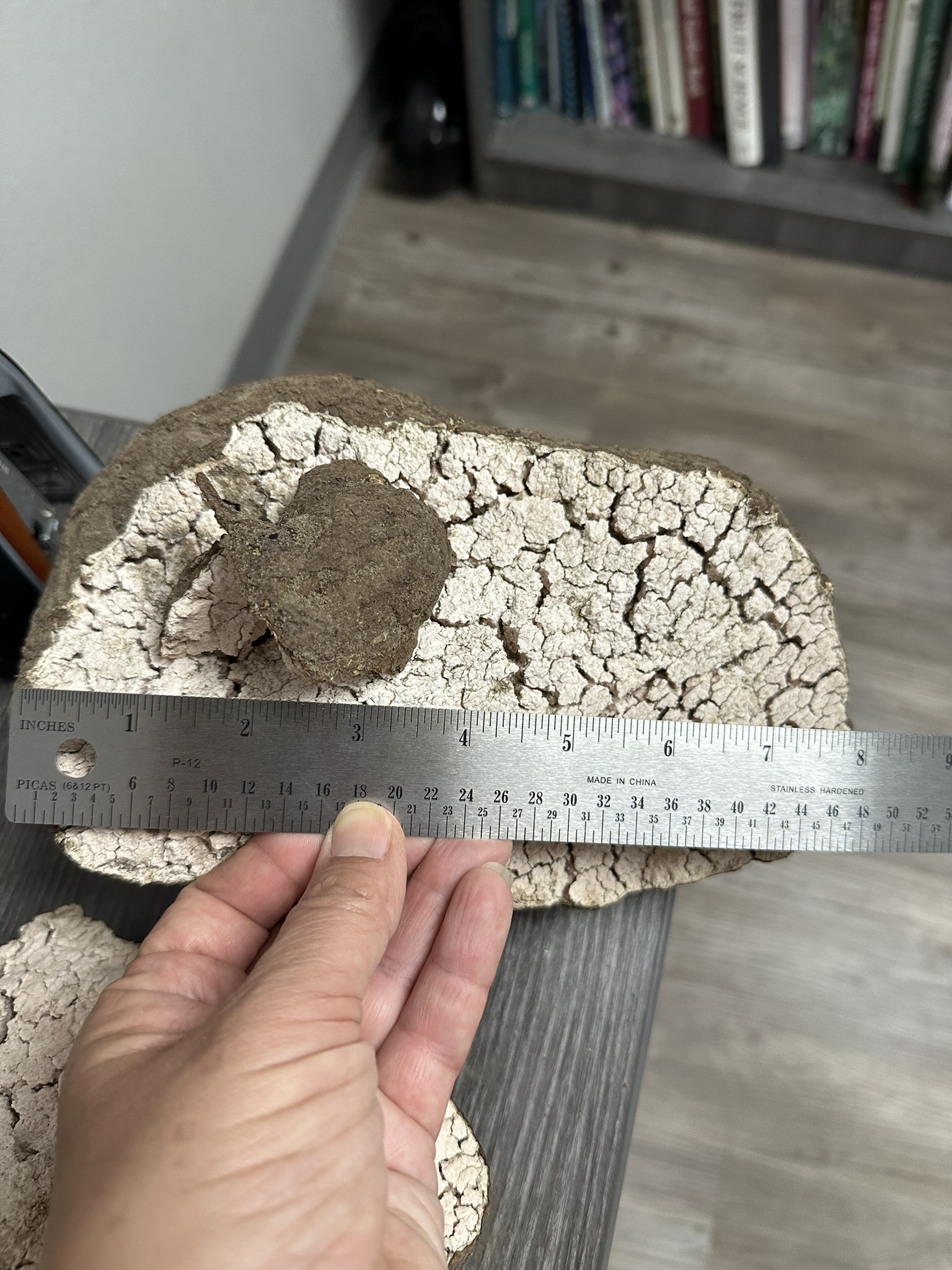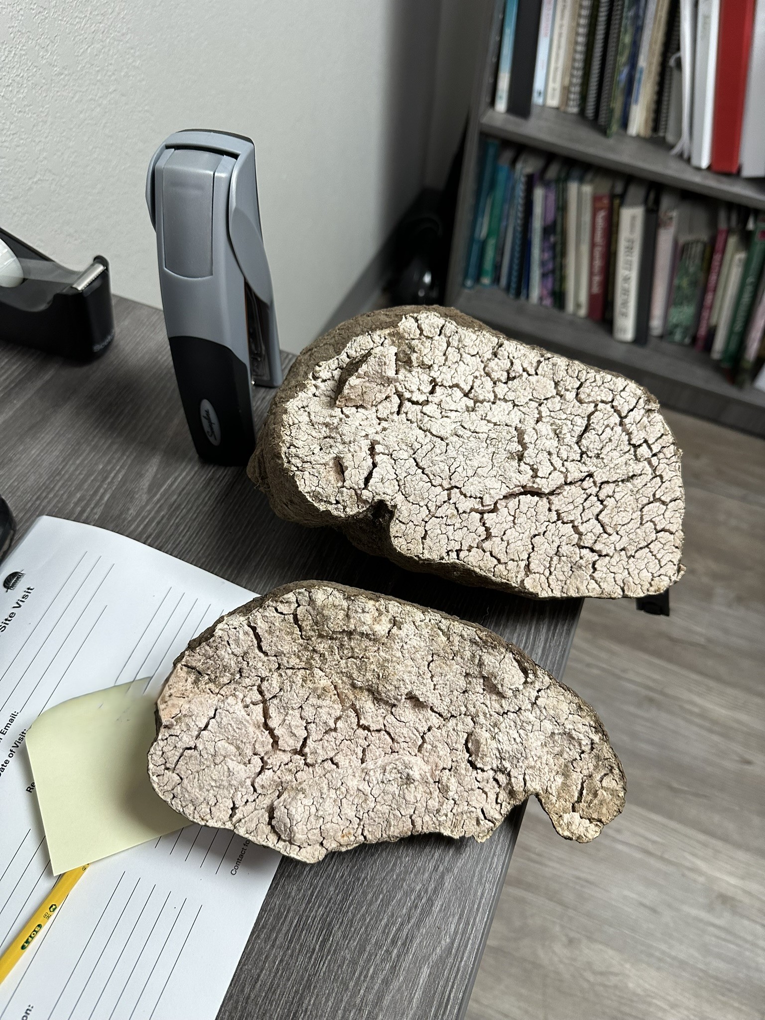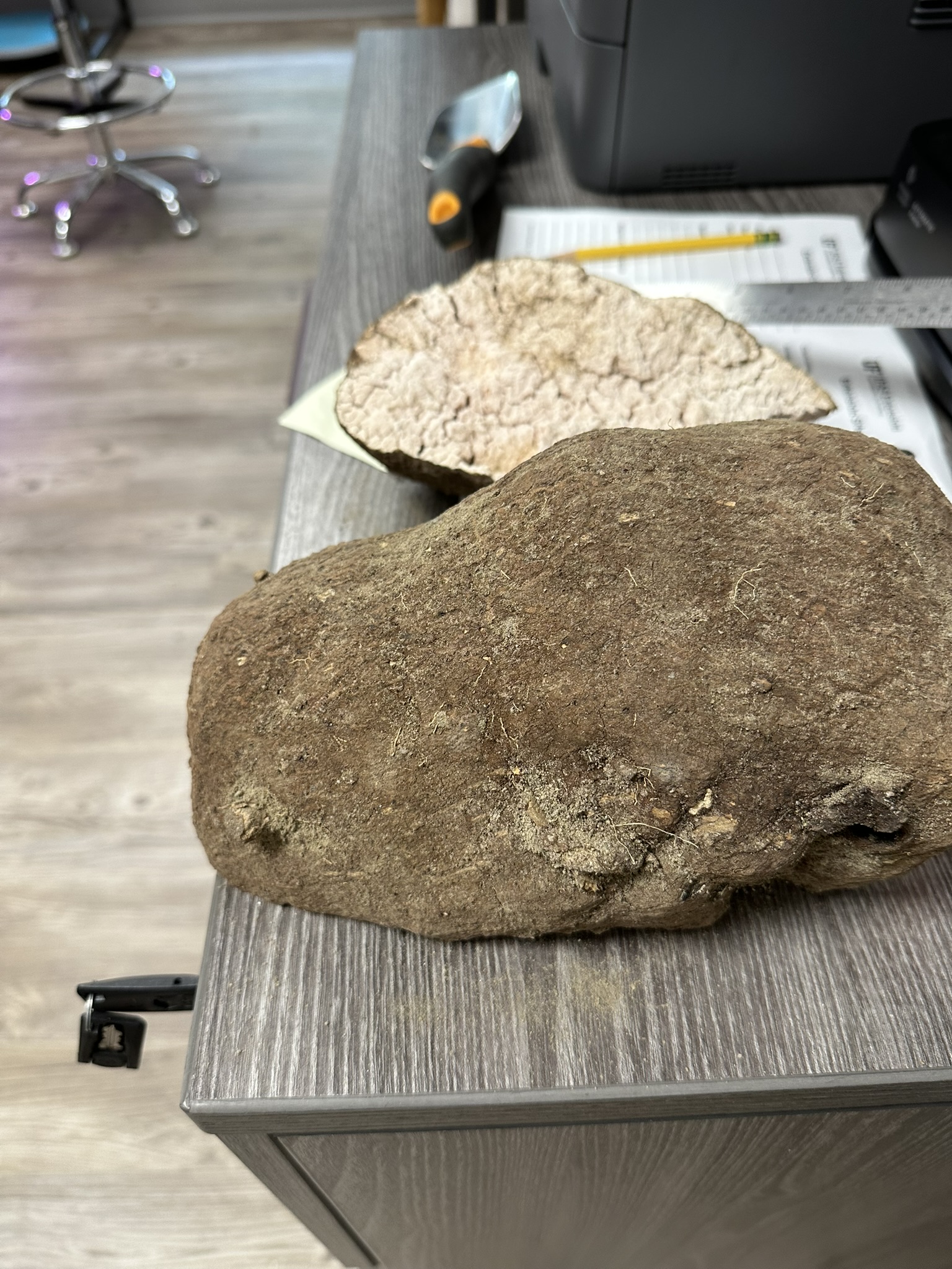 I knew I needed more information about the source of the mystery mass, so I called the landowner who dropped it off and obtained more details. They were plowing a portion of their property where volunteer pines had grown and described the area as non-irrigated, dusty sand. This lumpy object was turned up from the soil and piqued their curiosity. They broke it open and the interior was a light pinkish tan and somewhat grainy in texture.