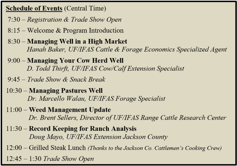 Since 1985, the University of Florida has provided a half-day educational conference and trade show of industry professionals for cattle ranchers in the Florida Panhandle, and the surrounding Alabama, and Georgia Counties. One of the core principles of this annual event is practical recommendations for cow-calf producers based on research-based information.