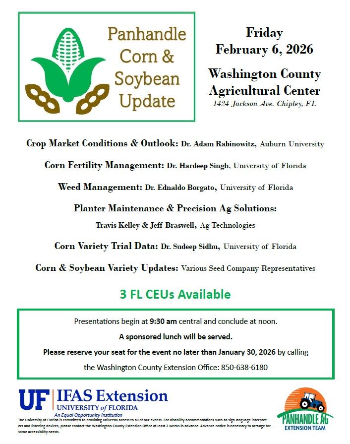 UF/IFAS Extension, Washington County will host the annual Panhandle Corn & Soybean Update on Friday, February 6th. Doors open at 9:00 AM (Central) with the meeting starting promptly at 9:30 AM and concluding with a sponsored lunch. The meeting will be held at the Washington County Agricultural Center located at 1424 Jackson Ave. Chipley, Florida.