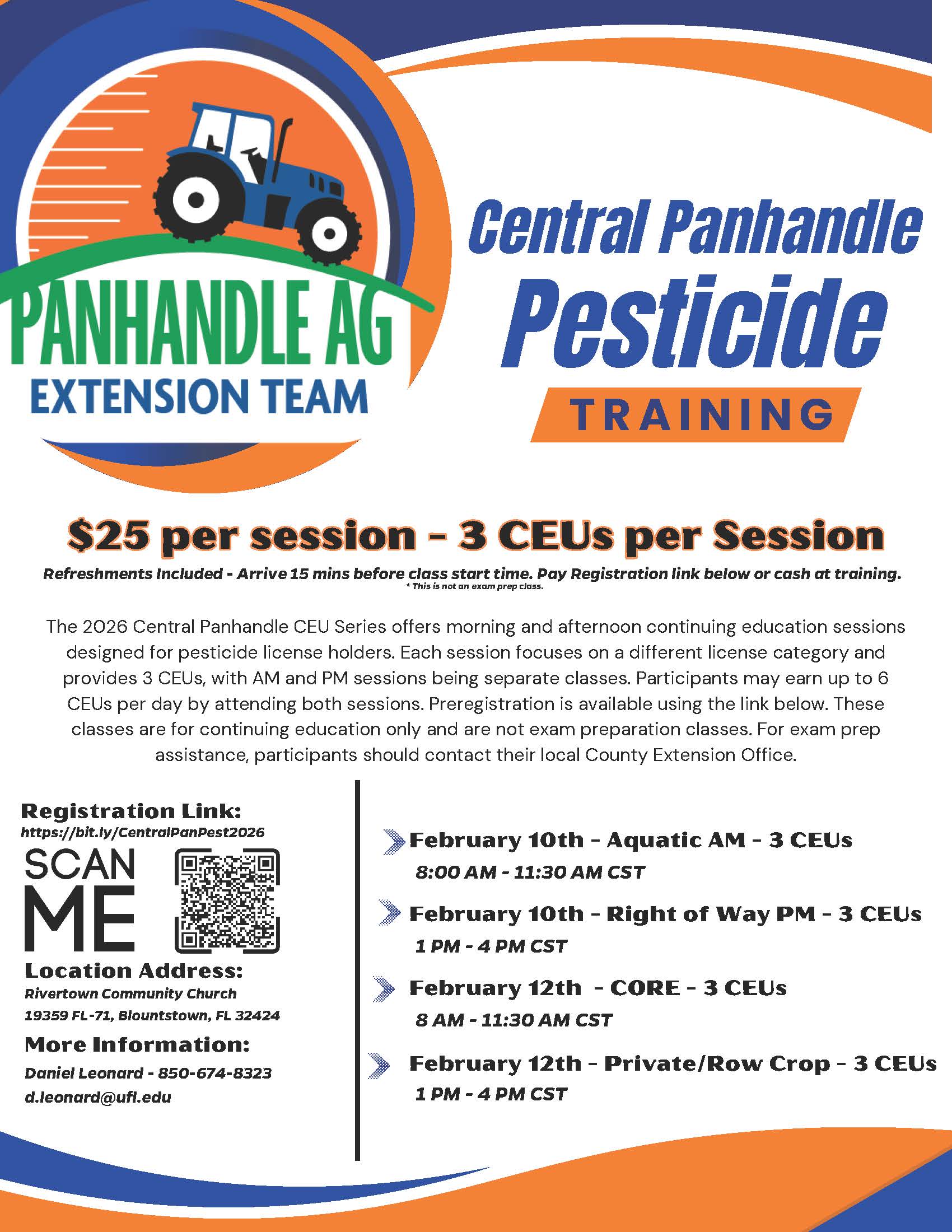 Get your pesticide applicator CEUs at the 2026 Central Panhandle Series! This series will be held in Blountstown, Florida, on February 10th and February 12th, 2026, and will offer morning and afternoon sessions. Each session will focus on a different license category and offer 3 CEUs. Preregistration can be submitted using the link below. The standard fee for the class is $25 per session. Fees can be paid online here or in cash at the start of each session. Each session will teach a unique set of topics that will support the continuing education of pesticide license holders. THESE ARE NOT EXAM PREP CLASSES. For help preparing for exams, clients should reach out to their local County Extension Office.