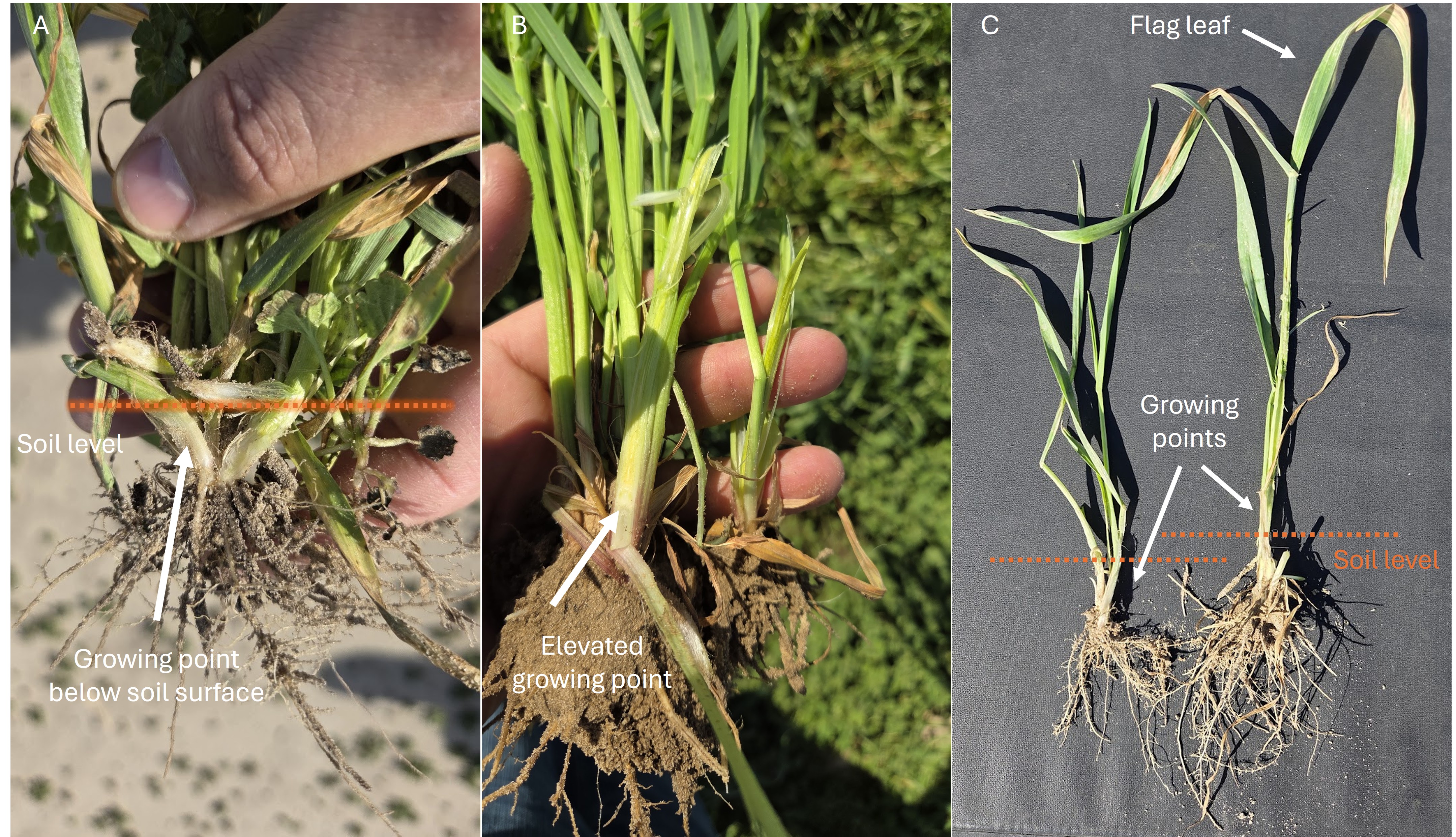 Figure 2. Oat in vegetative stage with growing points below soil surface (A), and in early reproductive stages with gowing points being elevated above soil surface (B). (C) shows a comparison between two plants in vegetative (left) and reproductive (right) stages, with the flag leaf already showing signs of cold injury.