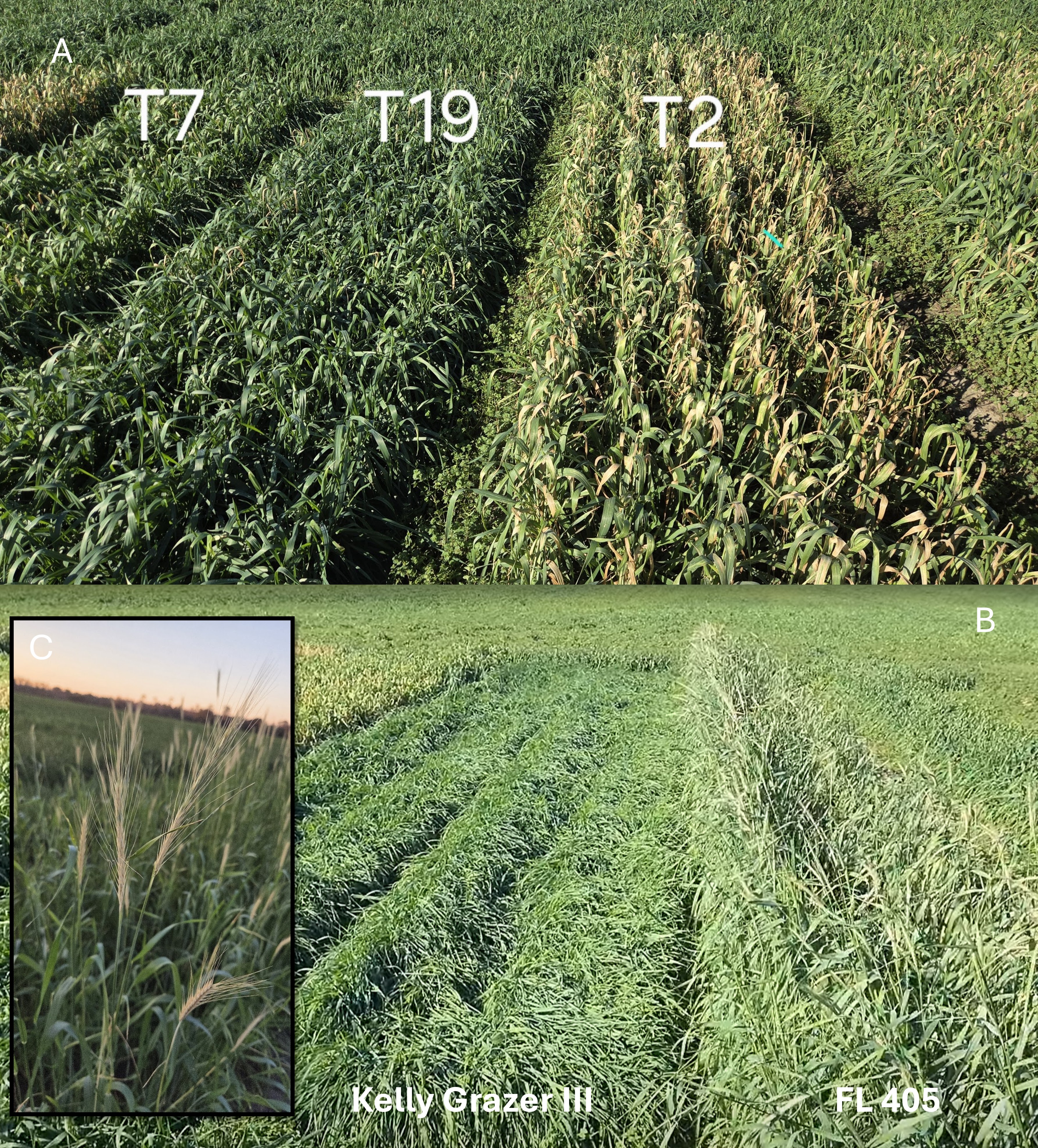 Figure 3. Triticale with different cold tolerances, where T2 had greater injury from cold than T19 or T7 (A). Differences in maturity in rye, where FL405 is a very early maturing material, and Kelly Grazer III is late (B). The early January frosts resulted in bleached seedheads for FL405 (C).