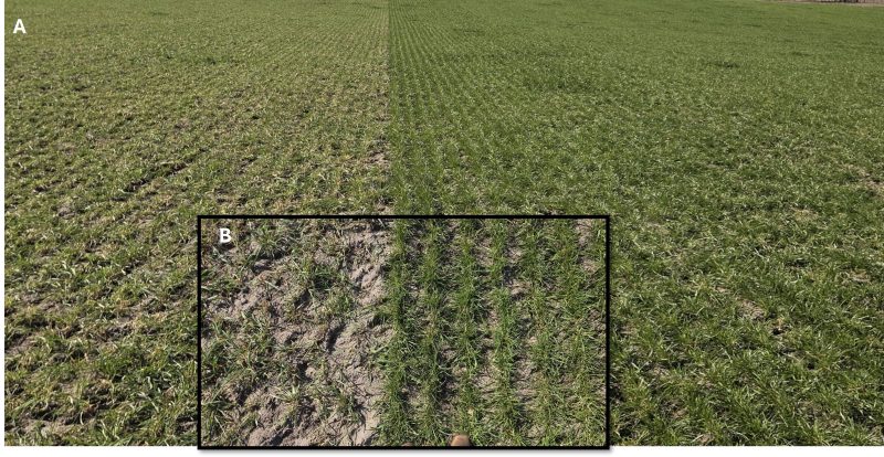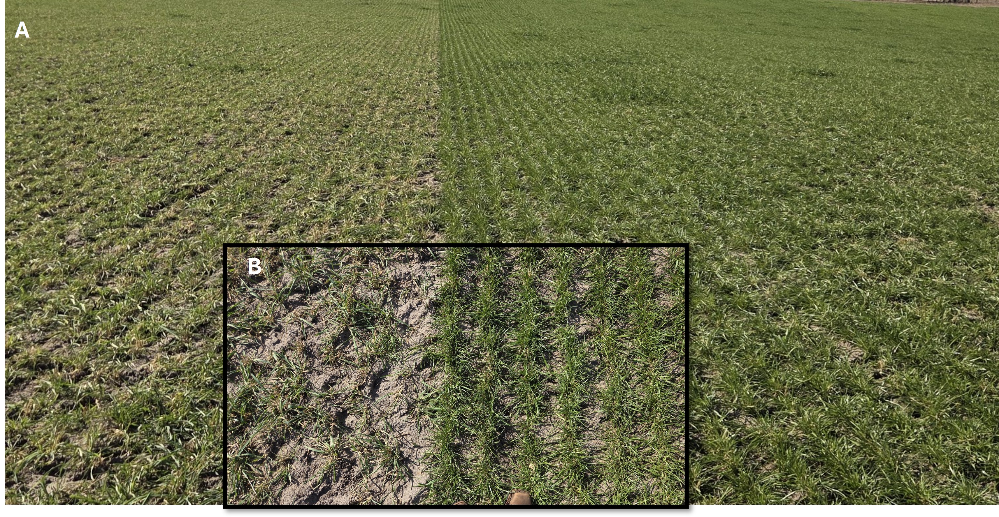 Figure 4. Overgrazing is detrimental to pasture growth and animal performance. The pasture on the right has a mixture of ryegrass, while the pasture on the left has only small grains. Ryegrass is lower growing and was able to avoid excessive grazing. Note on (B) the amount of exposed ground, meaning less radiation is captured by the plants, which results in slow regrowth. Overgrazing also exposes the growing points, which can be more damaged by the cold weather than a taller, denser canopy.