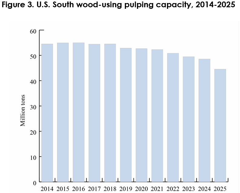 The continued decline in pine pulpwood prices reflects ongoing structural changes in the pulp and paper industry, including product shifts, increased use of recycled fiber, mill modernization, and relocation to lower-cost regions. These trends intensified in 2025, reducing regional demand for pulpwood and placing downward pressure on stumpage prices (Figure 3). Between 2023 and 2025, more than 10 major pulp facilities in the South closed, removing over 25 million tons of annual fiber demand and significantly reshaping regional pulpwood markets.