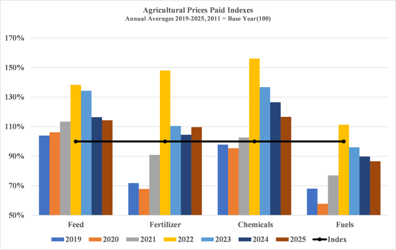 The “Agricultural Prices Paid Indexes” graph shows percentage changes in production costs in the U.S., according to the prices paid by farmers index estimated by USDA. The base year is 2011 (2011=100%). The prices paid index is a measurement of price change over time. For example, the average annual price index for feed in 2025 in the U.S was 114.3, meaning feed prices have increased by 14.3% since 2011. Average prices in 2025 for feed, chemicals, and fuels declined compared to 2024, except for fertilizer which increased by 5.2%. However, overall input prices are still above where they were pre-pandemic and the Russia-Ukraine war that began in 2022.