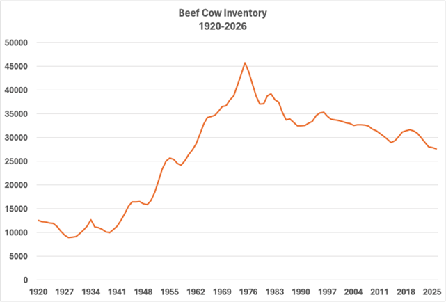 On January 30th, 2026, the USDA released the Cattle Inventory Report. All cattle and calves in the U.S. totaled at 86.2 million head, 0.4 percent below 2025’s January inventory. The U.S. cattle inventory has declined by 9 percent (8.5 million head) since the last cyclical peak in 2019, and is the smallest inventory of cattle in the U.S. since 1951 (75 years). 2026 will mark year 12 in the current cycle and could possibly be the bottom. But we will not know for sure if we are finished contracting until the January 2027 Inventory report.