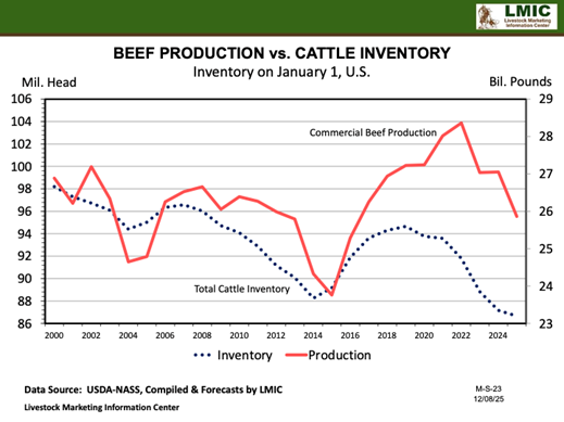 Average dressed weights reached new highs in 2025: 955 pounds for steers (931 in 2024) and 871 pounds for heifers (848 in 2024). Increased weights in 2024 helped to offset the overall decline in cattle slaughter, which resulted in 2024 beef production being slightly higher than 2023. But in 2025, increased weights were not enough to offset the overall decline in supplies. Beef production in 2025 declined by 4% to 26 billion pounds. The forecast for 2026 is another 1% decline, as supplies continue to tighten. A point to make though is that the industry is producing more beef with fewer cattle. Average production from a beef cow in 2025 was 928-pounds compared to 840-pounds in 2014, and 800-lbs in 2000.