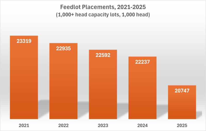 As of January 1, 2026, the total number of cattle on feed was 13.8 million head, down 3% year over year. A total of 20.7 million head were placed in feedlots in 2025, compared to the 22.2 million placed in 2024. A large contributor to lower placements is due to the closure of the Mexican border. Mexican cattle make up roughly 5% (~1 million head) of placements in the U.S. each year. In 2025, 228,00 head crossed the border. The border closure has certainly influenced already tight supplies (specifically in Southwest feedlots), but domestic supplies are expected to continue tightening.