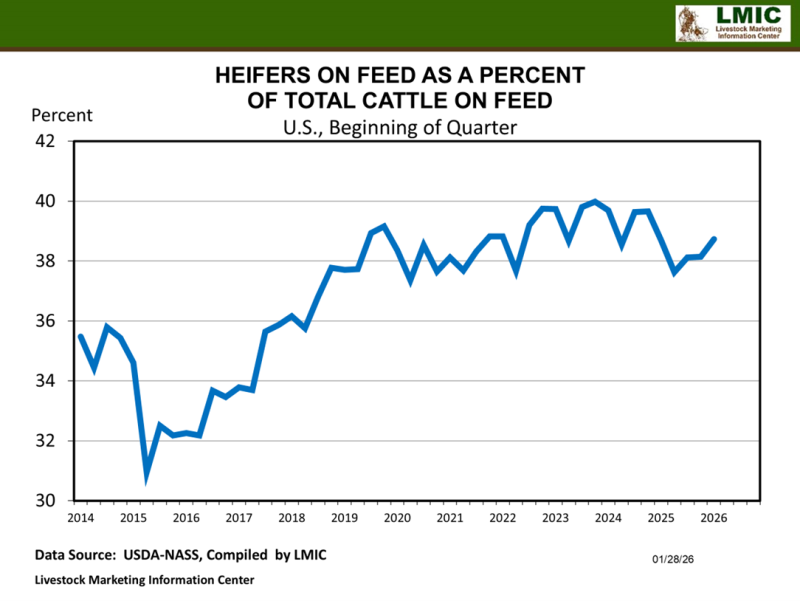 The percentage of heifers on feed as of January 1, 2026, was 38.7%, up 0.6% from October and unchanged from last January. Zero heifers from Mexico were placed in the fall months leading up to January 1, 2026, compared to the 145,585 head of Mexican heifers placed in the fall of 2024, before the closure in December 2024. The takeaway here is that even though the total number of heifers on feed has declined, that can likely be attributed to the lack of heifer placements from Mexico in 2025. The percentage of heifers on feed indicates that domestic heifers are not being largely retained as of now.