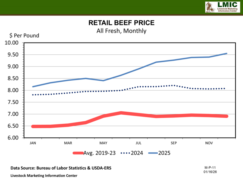While quantity of beef has declined, quality and price have done the opposite. As of the end of November 2025, beef graded prime increased to 12.03% from 10.86% in 2024 of all beef graded. In 2025, there were four months when the prime percentage was higher than the select percentage which has not historically been the case. Yield grades have also seen some changes with increases year-over-year in 4s (by 1.4%) and 5s (by 1.02%).