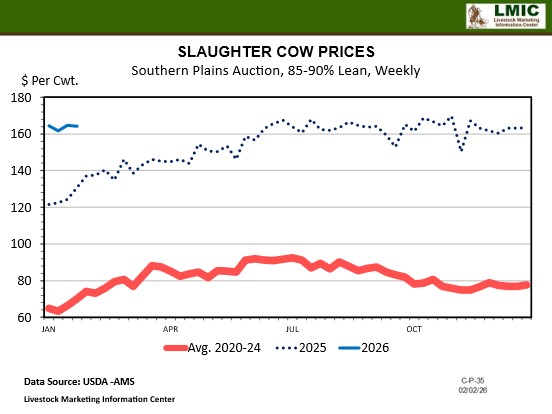 Cull cow prices in Florida have increased by 27% year-over-year, and by 54% since January 2024. With strong demand for ground beef products along with increased fat trimmings from heavier fed cattle carcasses, prices for cull cattle have increased as the need for lean trimmings has increased. We saw a large decline in beef cow slaughter in 2025, likely due to producers wanting one more high-priced calf out of older cows. Additionally, liquidation was so heavy over the last several years that there may not have been much left to cull. Producers will be making the decision this year on if those older cows will be kept for another year or replaced with younger females.