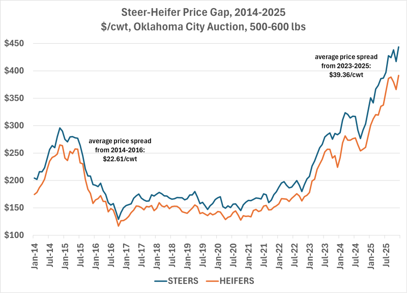 As of now, the steer-heifer spread has not narrowed enough to indicate heifer retention. As less weaned heifers enter the market, their value will increase as buyers will still be looking to fill loads, causing the spread to narrow. Using Oklahoma City prices, (Florida data only available back to 2017), the average steer-heifer price spread from 2014-2016 was $22.61/cwt. From 2023-2025, the price spread was $39.36/cwt. In Florida, the spread the week of January 31st, 2026, was $67.43/cwt between 500-600-pound steers and heifers.