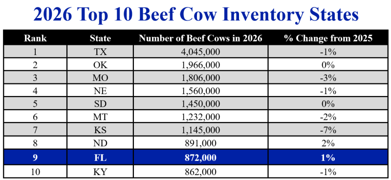 Following a 7,000-head increase in 2025, Florida beef producers appear to be moving towards herd stabilization in 2026. Florida now ranks 9th in beef cow numbers compared to 10th in 2025. The number of heifers intended for beef cow replacements in Florida was unchanged from 2025 at 115,000 head. We did not see an increase in replacement heifers in 2025 from 2024 either, after seeing a 4 percent decline from 2023 to 2024. So again, it appears Florida is moving towards stabilization but is still slow in rebuilding through heifer retention. Florida’s calf crop increased by 1 percent to 780,000 head.